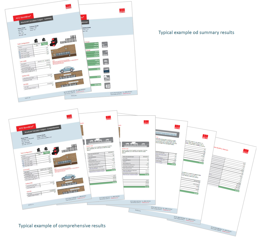 The results, along with the project details and inputted data, will be shown in a simple manner which easily can be interpreted to show whether the Stormbrixx chosen will be compatible for the installation and loads. This is color coded with green fields showing compatibility and red fields showing incompatibility